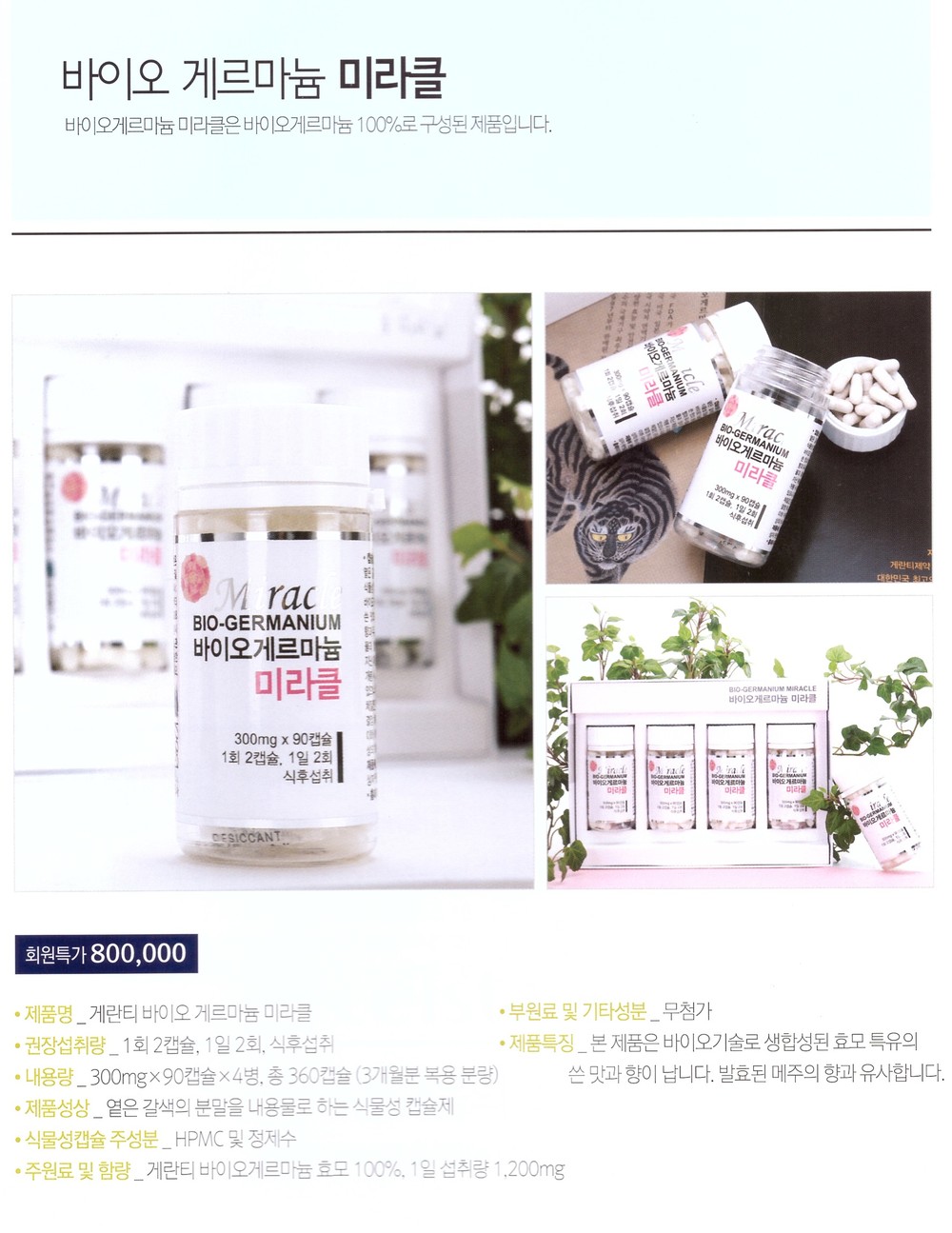 제품특징 본 제품은 바이오기술로 생합성된 효모 특유의 쓴 맛과 향이 납니다. 발효된 메주의 향과 유사합니다.제품 차이점 클래식은 다양한 비타민과 미네랄 등의 부원료가 함유되어 있고, 미라클은 오로지 바이오게르마늄 만으로 만들어진 제품입니다.