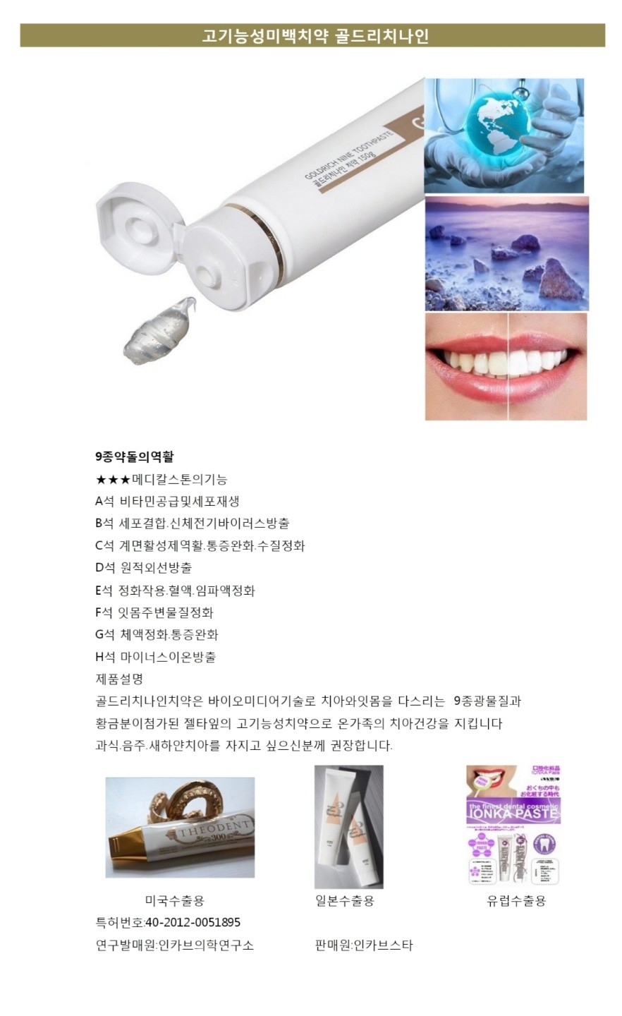 골드리치나인 치약은 구취 제거와 충치 예방에 효과가 있으며 새하안 충치예방에 효과가 있으며 새하안 치아를 유지하는데 도움을 줍니다.
