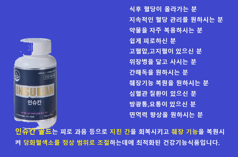 인슈칸 골드는 피로 과음 등으로 지친 간을 회복시키고 췌장 기능을 복원시켜 당화혈색소를 정상 범위로 조절하는데에 최적화된 건강기능식품입니다